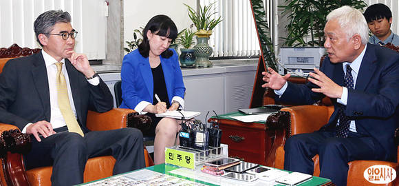 김한길 민주당 대표(사진 오른쪽)가 28일 오후 서울 여의도 국회 민주당 당대표실에서 성김 주한 대사 예방 자리에서 열변을 토하고 있다.
