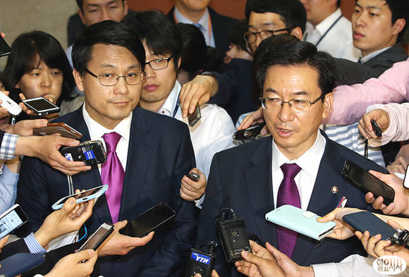 새누리당 윤상현 원내수석부대표(왼쪽)와 민주당 정성호 원내수석부대표가 28일 오후 국회 정론관에서 6월 임시국회의 의제와 세부 의사일정에 대해 발표 후 취재진들에게 둘러싸여 있다.