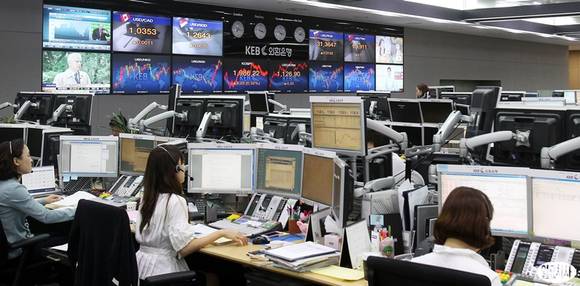 28일 오후 서울 중구 명동 외환은행 딜링룸에서 딜러들이 업무를 보고 있다. 이날 코스피지수는 전날보다 6.25포인트(0.32%) 오른 1986.22에 거래를 마감, 원·달러 환율은 전날보다 4.50원 상승한 1126.90원에 장을 마쳤다.