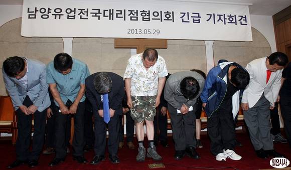 29일 오전 서울 종로구 연지동 한국기독교회관에서 열린 남양유업전국대리점협의회 긴급 기자회견에서 안희대 협의회장을 비롯한 회원들이 고개 숙여 인사를 하고 있다.