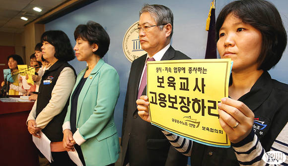 민주당 남윤인순, 김용익 의원과 공공운수노조연맹 등 시민단체 회원들이 29일  서울 여의도 국회 정론관에서 기자회견을 열고 어린이집 비리척결과 내부고발보육교사 블랙리스트 근절을 촉구하고 있다.