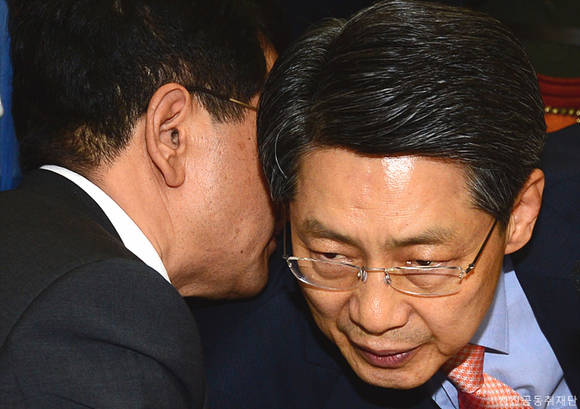 29일 오전 국회에서 열린 산업통상자원위원회 통상·에너지소위에서 한진현 산업통상자원부 차관(왼쪽)과 조인국 한국전력 국내부사장이 밀양 송전탑 사태와 관련해 이야기를 나누고 있다.