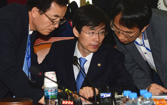 29일 오전 국회에서 열린 산업통상자원위원회 통상·에너지소위에서 조경태 소위위원장(사진 가운데)이 관계자들과 이야기를 나누고 있다.