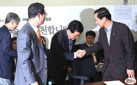김기현 새누리당 정책위의장이 29일, 서울 여의도 국회 새누리당 정책위의장실에서 원전 가동중단에 따른 전력수급 대책 당정회의 직전, 한진현 산자부 제2차관과 악수를 나누고 있다.