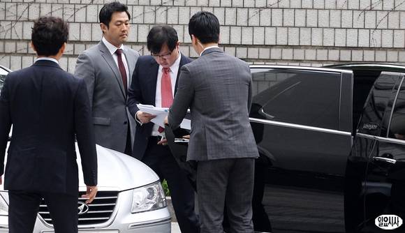 횡령과 배임 혐의 등으로 기소된 최재원 SK그룹 수석부회장이 29일 오후 서울 서초동 서울고등법원에서 열린 항소심 5차 공판에 출석하기 위해 차에서 내리고 있다.