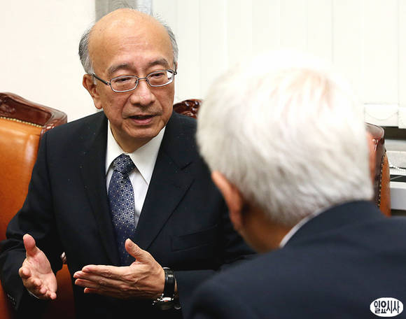 29일, 서울 여의도 민주당 당대표실에서 뱃쇼 코로 일본대사(사진 왼쪽)와 김한길 대표가 이야기를 나누고 있다.