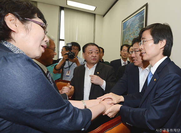 민관이 첨예하게 맞붙었던 밀양 송전탑 공사 문제가 29일, 국회가 제시한 중재안인 ‘전문가 협의체’ 구성으로 일단락된 가운데, 조경태 소위위원장(사진 오른쪽), 강창일 산자부위원장(사진 가운데) 등 관계자들이 일일이 악수를 나누고 있다.