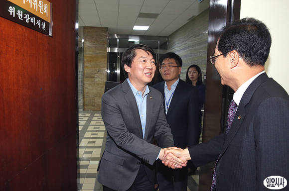 안철수 의원(무소속)이 29일 오후, 오제세 보건복지위원장(민주당)을 찾아 악수를 나누고 있다.