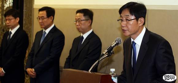 편의점 씨유(CU)를 운영하는 BGF리테일이 최근 편의점주 자살 사건과 관련해 30일 서울 대치동 섬유센터에서 대국민 사과 기자회견을 열었다. 박재구 BGF리테일 사장(맨 오른쪽) 및 임원진이 유족과 국민들에게 대국민 사과를 하고 있다.