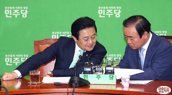 30일 오후 6월 임시국회를 앞두고 서울 여의도 국회 민주당 원내대표실에서 열린 상임위원장-간사단 연석회의에서 장병완 정책위의장(사진 오른쪽)이 전병헌 원내대표와 회의자료를 확인하고 있다.