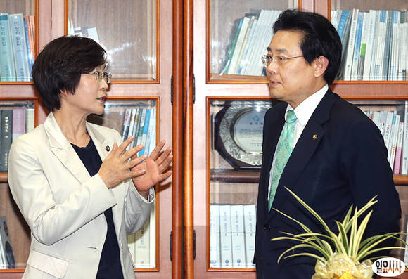 30일 오후 6월 임시국회를 앞두고 서울 여의도 국회 민주당 원내대표실에서 열린 상임위원장-간사단 연석회의 후 전병헌 원내대표가 김상희 여성가족위원장(사진 왼쪽)과 이야기 도중 곤란한 표정을 짓고 있다.