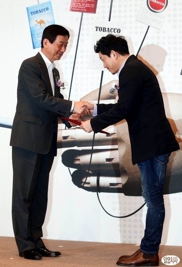 진영 보건복지부 장관(왼쪽)이 31일 오전 서울 중구 프레스센터에서 열린 '제26회 세계금연의 날 기념식'에서 배우 이범수에게 금연 홍보대사 위촉장을 수여하고 있다.