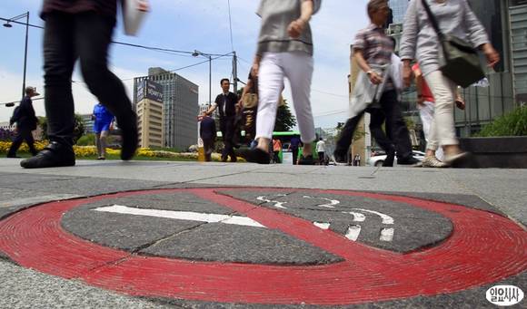 세계 금연의 날인 31일 서울 청계광장 보행지역 바닥에 금연거리를 알리는 표시가 돼 있다.