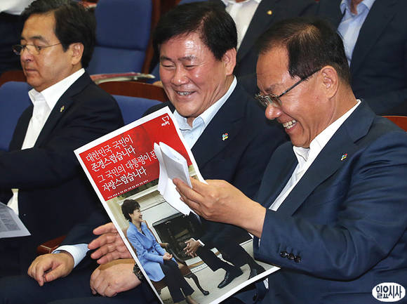 3일 오전 서울 여의도 국회에서 황우여 대표최고위원(사진 오른쪽)을 비롯한 당 지도부가 참석한 가운데 최경환 원내대표(사진 가운데)와 새누리당보를 보고 활짝 웃고 있다.