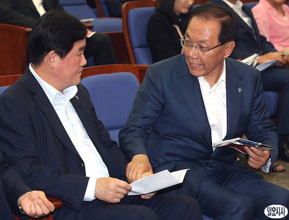 3일 오전 서울 여의도 국회에서 새누리당 황우여 대표최고위원(사진 오른쪽)을 비롯한 당 지도부가 참석한 가운데 황 대표와 최경환 원내대표가 대화를 나누고 있다.
