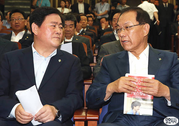 3일 오전 서울 여의도 국회에서 새누리당 황우여 대표최고위원을 비롯한 당 지도부가 참석해 의원총회가 열리는 가운데 최경환 원내대표(사진 왼쪽)와 황 대표가 이야기를 나누고 있다.