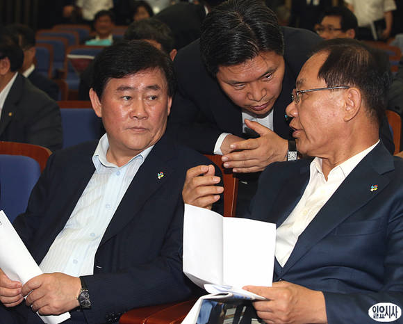 3일 오전 서울 여의도 국회에서 황우여 대표최고위원을 비롯한 당 지도부가 참석해 의원총회가 열리는 가운데, 황 대표(사진 오른쪽), 최경환 원내대표(사진 왼쪽), 홍문종 사무총장이 대활ㄹ 나누고 있다.