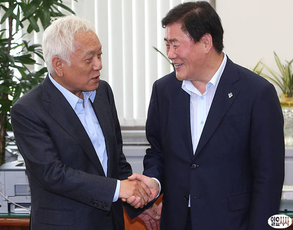 김한길 민주당 대표가 3일 오전 서울 여의도 국회 당대표실에서 최경환 새누리당 원내대표의 예방을 받고 악수를 나누고 있다.