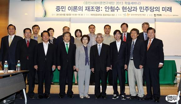 3일 오후 서울 중구 남대문로 대한상공회의소에서 '중민이론의 재조명, 안철수 현상과 민주당의 미래'라는 주제로 열린 중민재단 2013 학술세미나에 앞서 한상진 중민사회이론연구재단 이사장(앞줄 오른쪽 두번째)를 비롯한 참석자들이 기념촬영을 하고 있다.