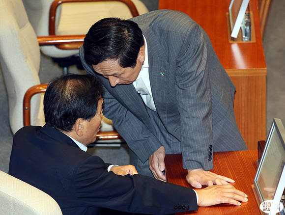 새누리당 이재오 의원(사진 왼쪽)이 3일 오후, 국회 본회의장에서 김기현 정책위의장과 이야기하고 있다.