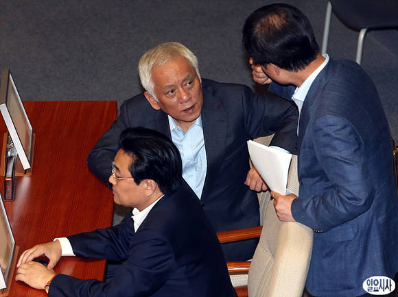 김한길 민주당 대표와 신경민 최고위원이 3일 오후, 국회 본회의장에서 이야기하고 있다.