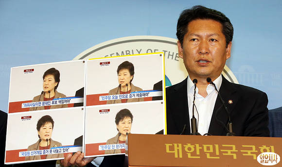 정청래 의원(사진) 등 민주당 국정원 불법선거개입사건 진상조사특위와 법제사법위원회 소속 의원들이 3일 서울 여의도 국회 정론관에서 기자회견을 하고 있다.