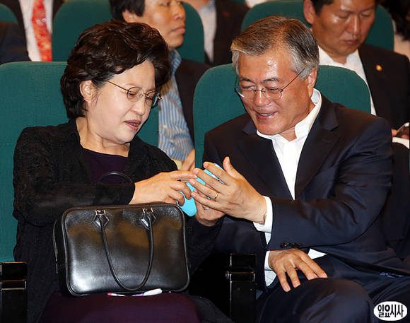 고(故) 노무현 전 대통령의 부인 권양숙 여사(왼쪽)가 3일 서울 여의도 국회 도서관에서 열린 참여정부 인사 이야기를 담은 책 '대통령의 인사' 출판기념회에 참석해 문재인 민주당 의원과 휴대폰을 보고 있다.