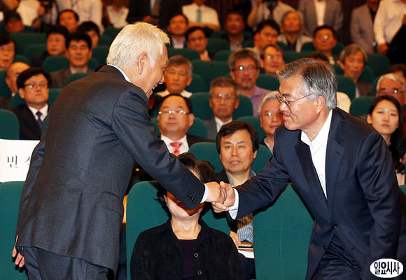 김한길 민주당 대표가 3일, 서울 여의도 국회 도서관에서 열린 참여정부 인사 이야기를 담은 책 '대통령의 인사' 출판기념회에 참석해 문재인 민주당 의원과 악수를 나누고 있다.
