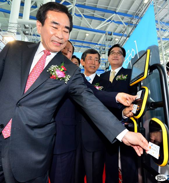 4일 오전 서울역에서 열린 '전국 호환 교통카드' 시연행사에서 여형구 국토교통부 제2차관을 비롯한 참석자들이 교통카드 시연을 해 보고 있다.