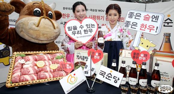 한우자조금관리위원회와 전통주 기업인 국순당이 4일 오전 서울 청계광장에서 한우와 전통주산업에 대한 소비자들의 관심을 유도하기 위해 '우리 한우 우리 술 사랑하기' 공동캠페인을 진행하고 있다.