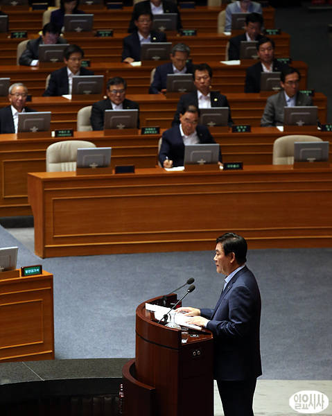 최경환 새누리당 원내대표가 4일 오전, 서울 여의도 국회 본회의장에서 교섭단체 대표연설을 하고 있다.