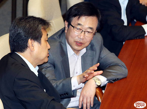 김무성 의원(사진 왼쪽)이 4일 오전, 서울 여의도 국회 본회의장에서 서병서 의원과 이야기를 나누고 있다.