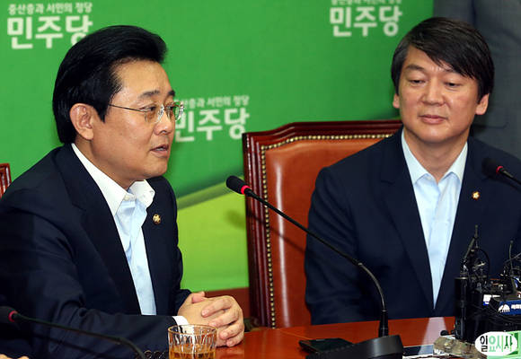 무소속 안철수 의원(사진 오른쪽)이 4일, 전병헌 민주당 원내대표를 예방한 자리에서 전 원내대표의 이야기를 듣고 있다.