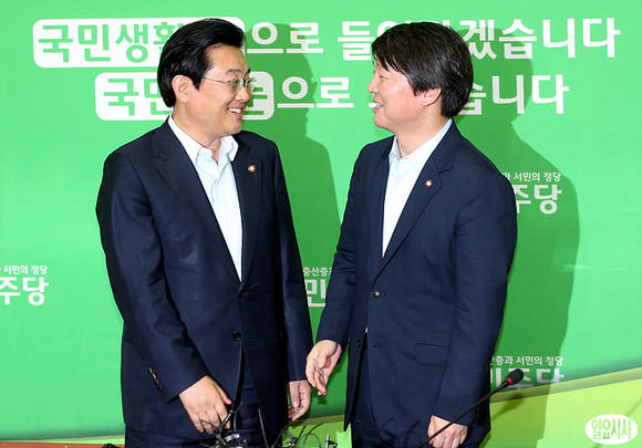 무소속 안철수 의원(사진 오른쪽)이 4일, 전병헌 민주당 원내대표를 예방한 자리에서 환하게 웃음 짓고 있다.