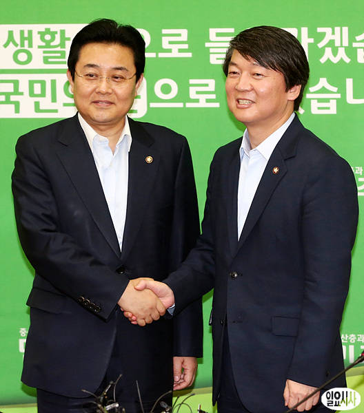 무소속 안철수 의원(사진 오른쪽)이 4일, 전병헌 민주당 원내대표를 예방한 자리에서 악수하고 있다.