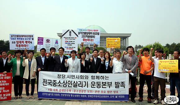 4일 오후 서울 여의도 국회의사당 앞에서 민주당 을지키기위원회와 진보정의당 중소상공인위원회, 시민사회 단체 주최로 열린 '전국 을 살리기 운동본부' 발족식에서 참가자들이 화이팅을 외치고 있다.