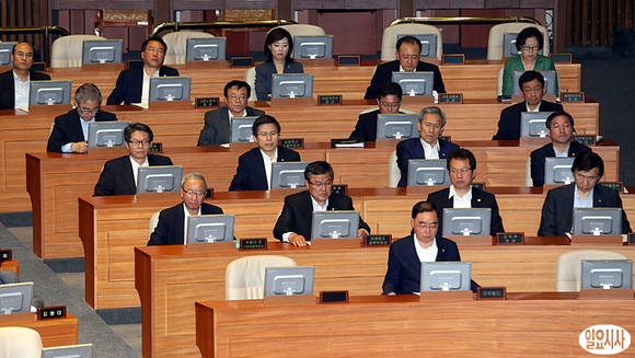 5일, 서울 여의도 국회 본회의장에서 열린 교섭단체대표연설에서 정홍원 국무총리 등 국무위원들이 김 대표의 연설을 경청하고 있다.