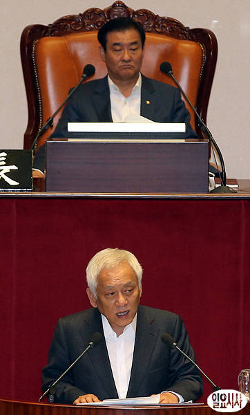 민주당 김한길 대표(사진 아래)가 5일, 서울 여의도 국회 본회의장에서 교섭단체대표연설을, 강창희 의장이 깊은 생각에 잠겨 있다.