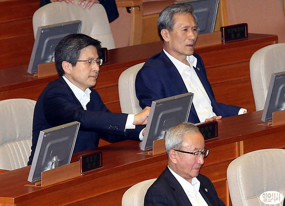 민주당 김한길 대표가 5일, 서울 여의도 국회 본회의장에서 교섭단체대표연설을 하고 있는 가운데, 김관진 국방부장관(사진 오른쪽), 현오석 경제부총리 등이 발언을 경청하고 있다.
