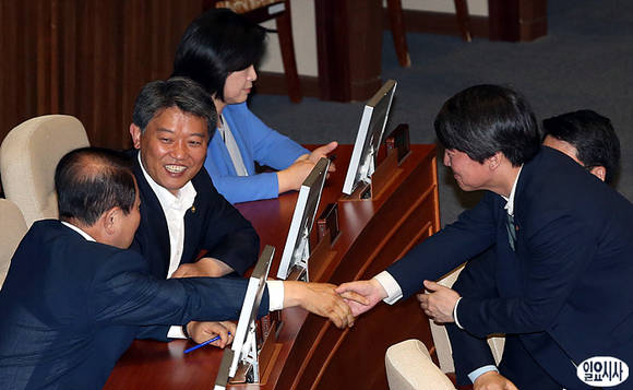 민주당 김한길 대표의 5일, 서울 여의도 국회 본회의장 교섭단체대표연설 직전, 무소속 안철수 의원(사진 오른쪽)과 민주당 박주선 의원이 악수하고 있다.