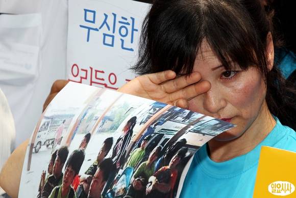 5일 오후 서울 세종로 외교부 정문 앞에서 자유와 인권을 위한 탈북자연대 주최로 열린 라오스 탈북청소년 9명 강제 북송 항의집회에서 한 참석자가 눈물을 닦고 있다.