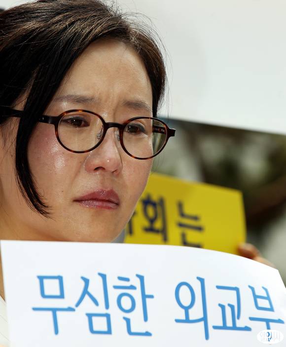 5일 오후 서울 세종로 외교부 정문 앞에서 자유와 인권을 위한 탈북자연대 주최로 열린 라오스 탈북청소년 9명 강제 북송 항의집회에서 한 참석자가 눈물을 흘리고 있다.