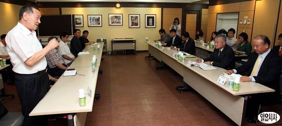 5일 오후 서울 종로구 태화빌딩 회의실에서 열린 남양유업 본사와 전국대리점협의회의 1차 협상에서 안희대 전국대리점협의회장이 모두발언을 하고 있다. 전국대리점협의회는 전국의 960개 현직 남양유업 대리점들로 이뤄진 단체로, 퇴직 점주 10여명의 모임인 피해자협의회와는 다른 단체다.