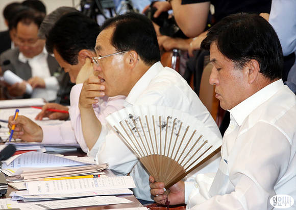 새누리당 이진복 의원(사진 오른쪽)이 5일 오후 국회 산업통상자원위원회 전체회의에서 더운 듯 부채질을 하고 있다.