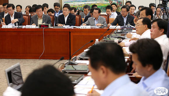 윤상직 산업통상자원부 장관, 김균섭 한국수자력원자력 사장이 5일 오후, 국회 산업통상자원위원회 전체회의에 참석해 의원들의 질의를 듣고 있다.