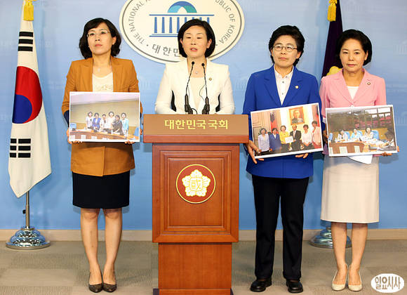 국회 여성가족위원회 공식방문단이 5일, 서울 여의도 국회 정론관에서 기자회견을 갖고 일본군 위안부 관련 망언에 대해 항의하고 있다. (좌측부터 새누리당 김현숙, 김희정, 민주당 유승희, 새누리당 류지영 의원)