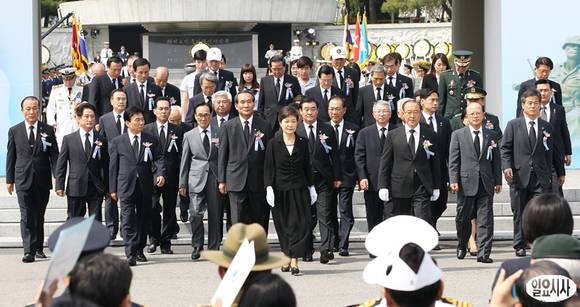 박근혜 대통령이 6일 오전 서울 동작동 국립현충원에서 열린 제58회 현충일 추념식에서 참석자들과 현충탑을 참배하고 있다.