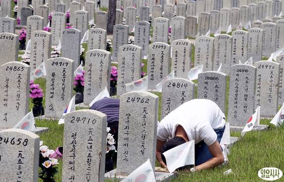 현충일인 6일 서울 동작동 국립서울현충원을 찾은 가족들이 참배를 하고 있다.