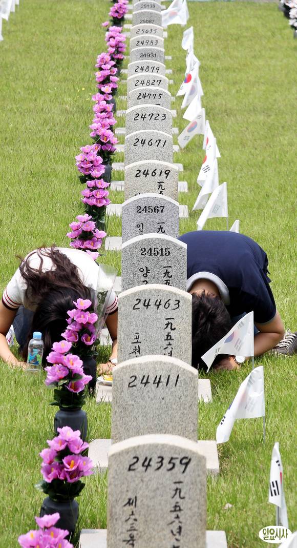 현충일인 6일 서울 동작동 국립서울현충원을 찾은 가족들이 참배를 하고 있다.