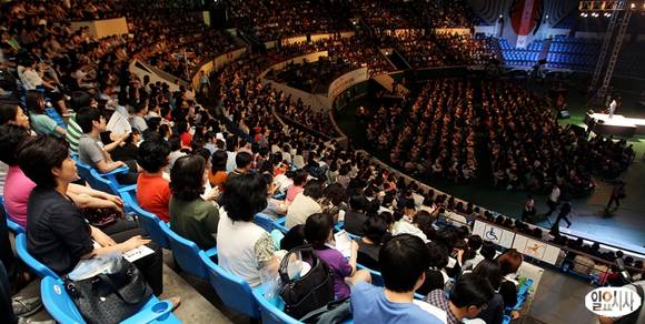 6일 오후 서울 잠실학생체육관에서 이투스청솔 교육평가연구소 주최로 열린 '6월 모의평가 분석 및 입시전략 설명회'에서 학생들과 학부모들이 강사의 설명을 경청하고 있다.